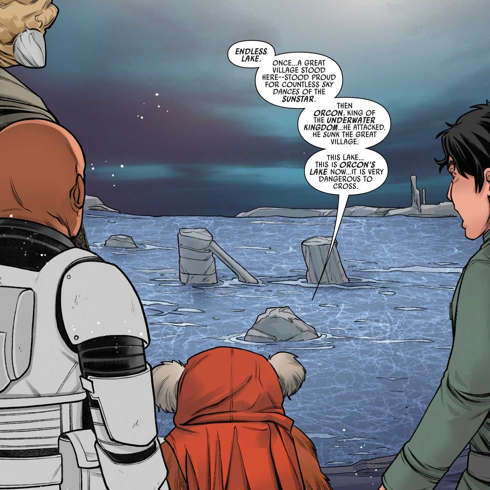 En Star Wars: Ewok #3 de Steve Orlando, Álvaro López, Laura Braga, Antonio Fabela y Joe Caramagna, un grupo de imperiales y mercenarios liderados por el general Tern Koyatta están buscando un depósito de armas en la luna forestal de Endor. Los imperiales han secuestrado al ewok Wicket W. Warrick de su aldea para que sea su guía después de descubrir que Wicket puede hablar básico galáctico. Mientras viajan, El grupo se encuentra con lo que Wicket llama Endless Lake.