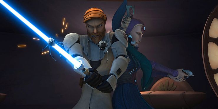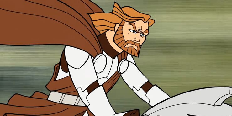 Este look proviene de los a menudo olvidados. Star Wars: Guerras Clon serie animada de 2003. Obi-Wan está decorado de pies a cabeza con una pesada armadura Clon con una capa, lo que le da la apariencia de un caballero medieval.