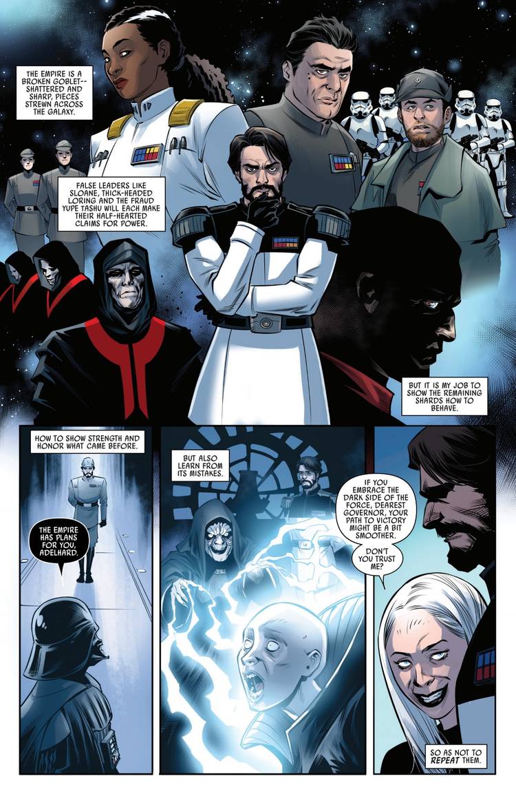 Mientras tanto, el Gran Moff Adelhard continúa desafiando al Gran Almirante Sloane y Gallius Rax. Sloane y Rax son los líderes imperiales que representan la facción más grande del Imperio (aparte de la suya) que buscan cumplir los deseos póstumos reales del Emperador Palpatine conocidos como Operación Ceniza, poniendo fin al Imperio por completo y comenzando en gran medida desde cero con el futura Primera Orden. Si bien el Moff Adelhard está condenado al fracaso en sus esfuerzos por crear el Nuevo Imperio, eso claramente no lo hace menos peligroso para la galaxia en este nuevo Imperio. guerra de las galaxias serie.