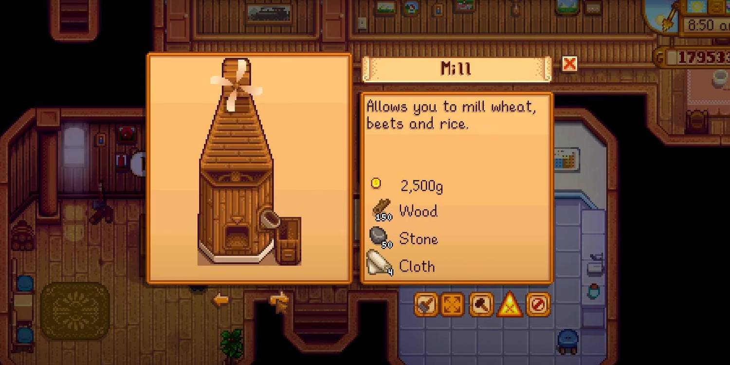Los molinos se desbloquean cuando compre sus planos en la carpintería por 2500 de oro en Valle stardew. Solo puedes hablar con el dueño de esta tienda, Robin, durante el día cuando la ubicación está abierta durante el horario comercial normal. Desafortunadamente tu No puedes hacer un molino incluso si tienes el dinero a menos que tengas 150 de madera, 50 de piedra y 4 de tela..