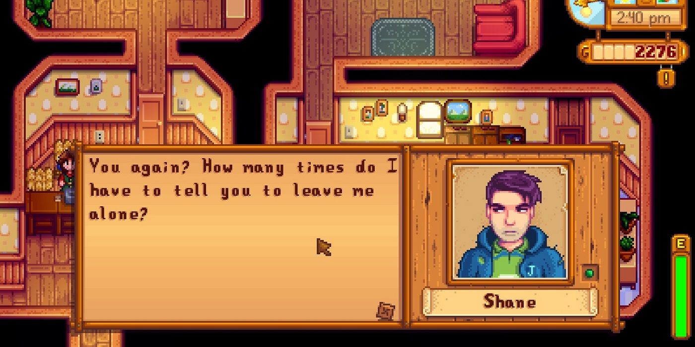 “/> stardew Valle El interés amoroso Shane es un personaje verdaderamente trágico. Trabaja en Joja Mart y desde el principio parece profundamente deprimido y desinteresado por los demás. Al vivir con su tía Marnie en su rancho, realiza los movimientos todos los días. Al involucrarse con Shane en Valle stardewel protagonista observa cómo toca fondo y luego, poco a poco, decide reconstruir su vida para mejor.
