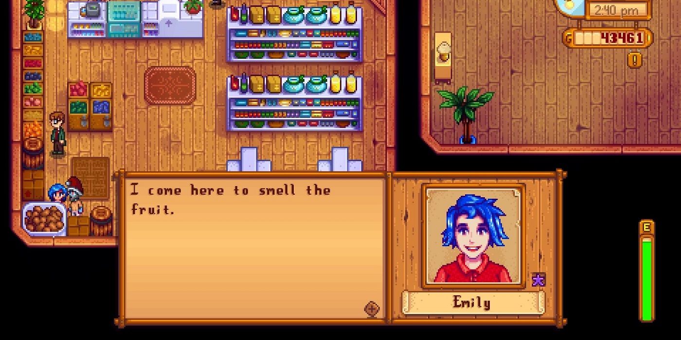 “/> Valle stardew Emily es una cocinera enérgica con una personalidad vivaz. Vive con su hermana Haley y juntas cuidan de la casa familiar. Emily trabaja para Gus en Stardrop Saloon y es buena amiga de Sandy del Desierto Calico. Romance con Emily en Valle stardew es similar al camino de Harvey como Experiencia relajada y linda con una historia más suave para que el jugador la desvele.