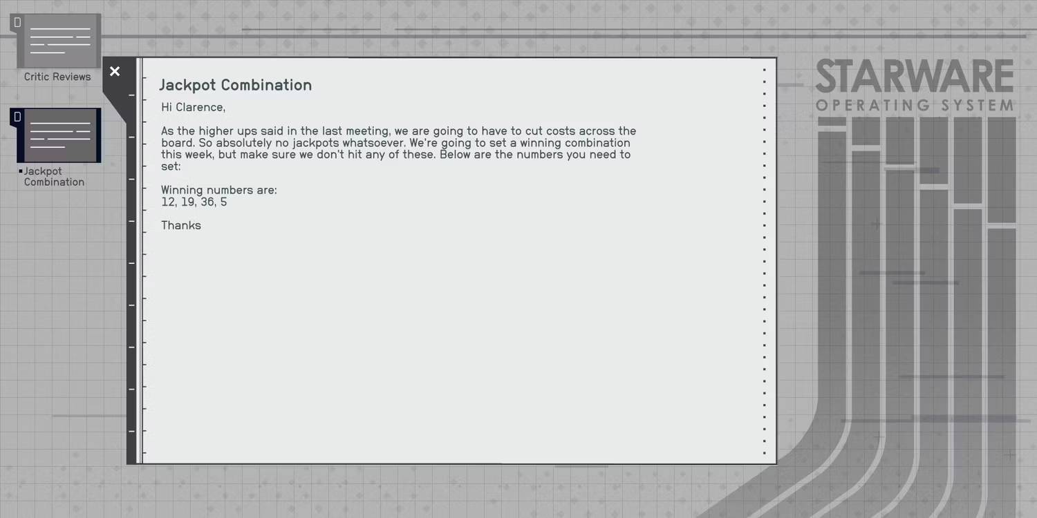 El problema con la combinación Almagest Jackpoint es que se pueden pasar por alto los números correctos para el código final. Los cuatro números que deben indicarse correctamente se pueden encontrar en la computadora del administrador, fuera del área de la bóveda y cerca de la barra. Como lo muestra el mensaje en la computadora, los números de combinaciones de Jackpot en campo estelar son 12, 19, 36y 5. Una vez que conozcas estos números, deberás regresar a la entrada secreta de la bóveda y seleccionar estos números para resolver el rompecabezas.