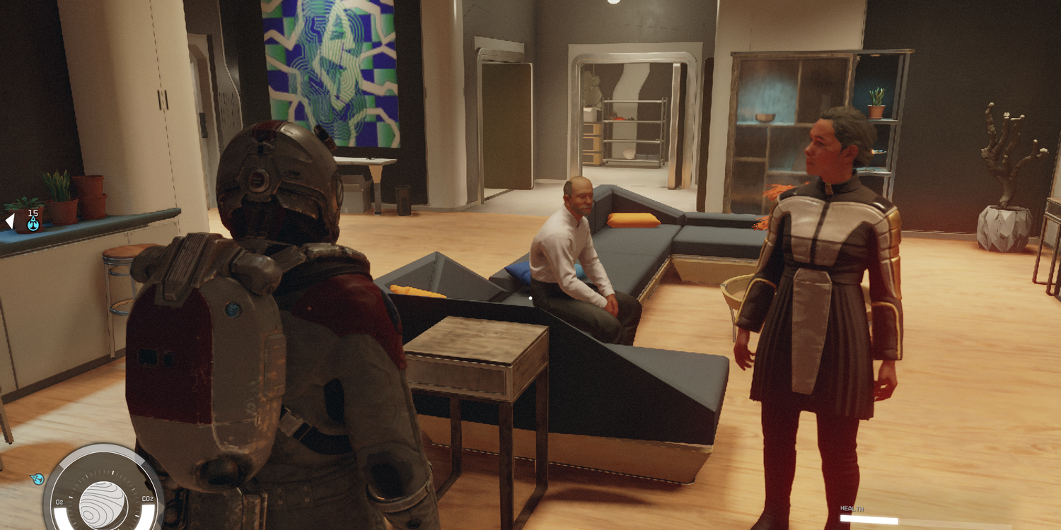 Sigue el pasillo una vez que estés fuera del ascensor e interactúa con la primera puerta que encuentres. Una vez que lo abras, deberías ver a tu padre bastante rápido, y él se sorprenderá al verte y llamará a tu madre. Él y tu madre hablarán contigo y podrás agotar el diálogo para contarles sobre tus aventuras y si has tenido un romance con un NPC en campo estelar todavía.