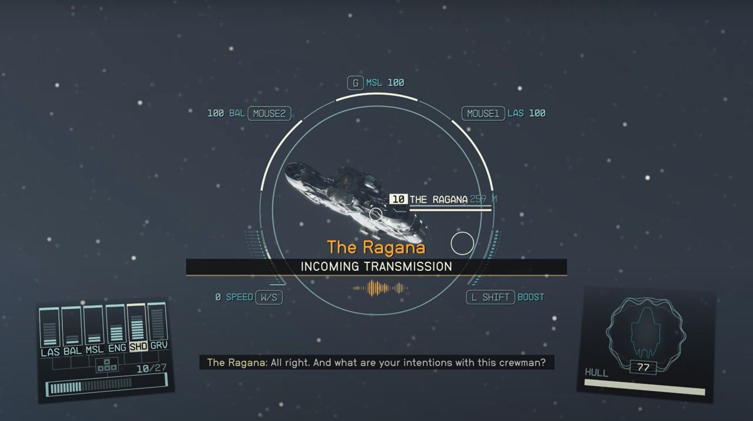 Si quieres fingir la muerte de Austin o explorar Ragana, atraca y aborda el barco. Una vez a bordo, si quieres saquear el barco, tendrás que traicionar a la tripulación y matar a todos los que están a bordo, incluido Rake. Si quieres mantener un sentido de dignidad y moralidad en este campo estelar misión, tendrás que convencer a la tripulación para que entregue Rake a UC SysDef. La tripulación está más que dispuesta a llevar a Rake a UC SysDef y fingir que lo mataron. Esta opción es la preferida entre todos los compañeros y no tiene ninguna repercusión con Crimson Fleet.