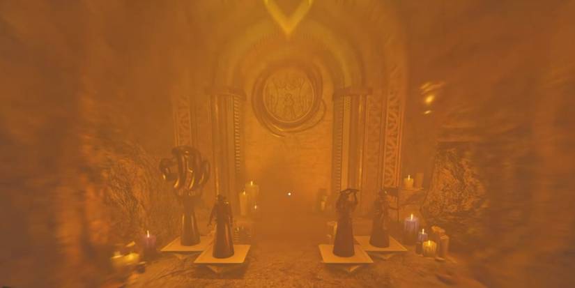 Una vez dentro, baja las escaleras. El camino desembocará en un túnel y se dividirá en una intersección. Manténgase a la izquierda aquí y siga el camino hacia un santuario lleno de velas. Apaga la vela frente al santuario y luego cruza la puerta cercana.