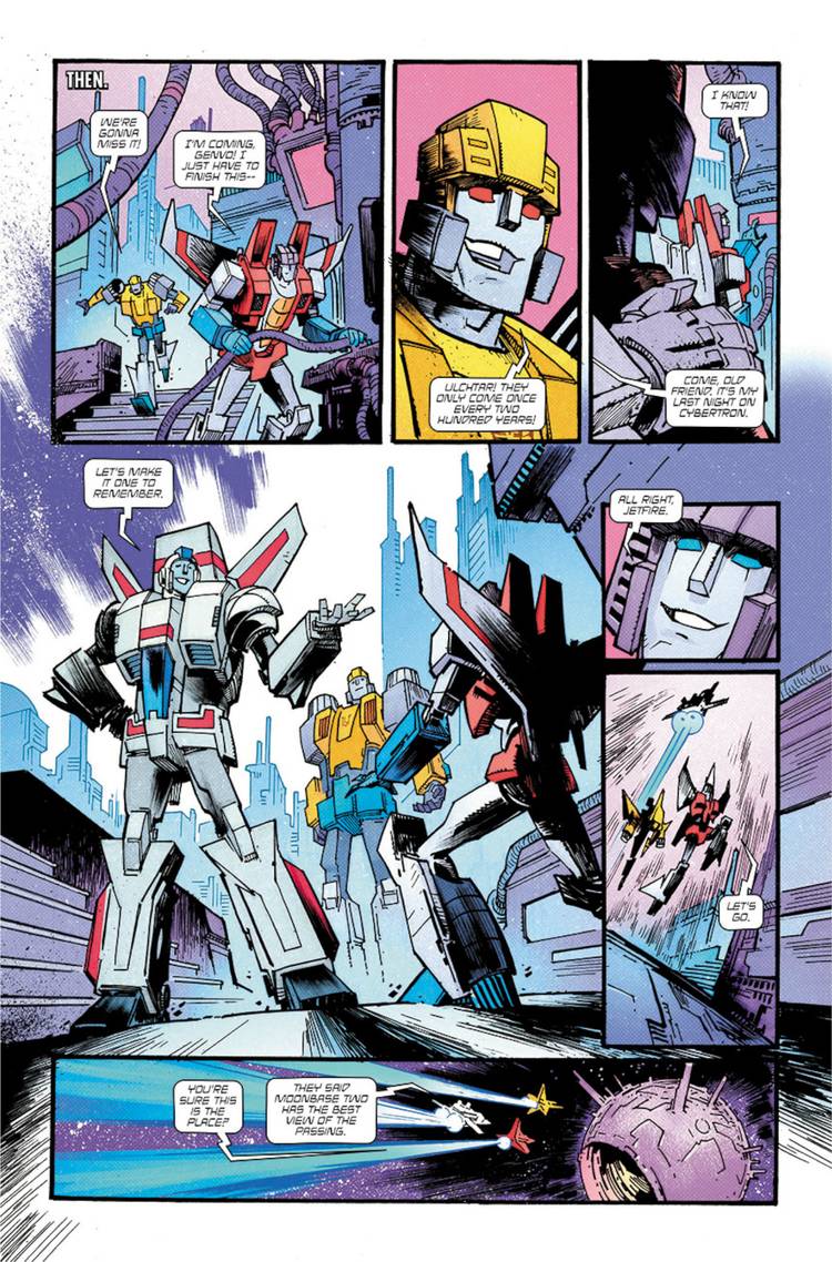 Transformadores #13 de Daniel Warren Johnson, Jason Howard, Mike Spicer y Rus Wooton continúa con Starscream después de su devastadora pelea contra Soundwave en el número 7 de la serie, debilitado por su devastadora paliza a manos de Soundwave. Sus flashbacks inconscientes no sólo dan Información muy necesaria sobre el origen de Starscream.pero también crear una imagen de cómo era Cybertron antes de la guerra.