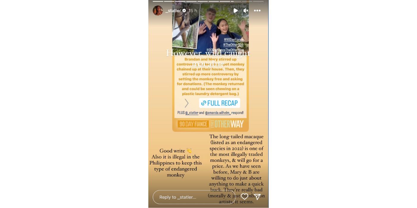 “/> Statler volvió a publicar una historia de Instagram de Starcasm en Instagram donde la publicación informó cómo Mary y Brandan crearon polémica al tener como mascota a un mono encadenado. Luego, la pareja provocó más problemas al liberar al animal en la naturaleza, pero no antes de pedir donaciones a los fanáticos. Statler escribió: “Parece que son estafadores realmente malos (moralmente y simplemente tontos).“