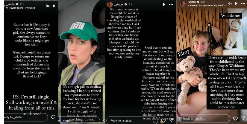 Statler confirmó que todavía está soltera y recuperándose de “toda esta locura.” Continuó diciéndoles a los fanáticos que felizmente arruinó su reputación para Dempsey cuando a este último no le importaba. Ella procedió a compartir una foto de Dempsey con los ositos de peluche de su infancia, Elroy y Wishbone, que realmente quiere recuperar y espera que no estén en un contenedor de basura en alguna parte. Statler cree que Dempsey vendió la camioneta para poder viajar por el mundo. También se puso en contacto con la mujer con la que Dempsey salió después de su ruptura, que es “todavía en terapia“ lidiando con el “Los problemas financieros, emocionales y físicos quedaron atrás.“