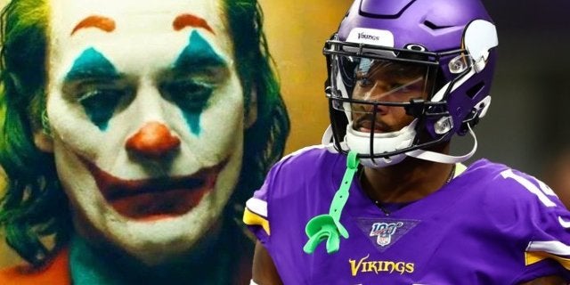 bufón está en medio de una carrera masiva mientras el público continúa acudiendo a los cines para ver de qué se trata todo este alboroto. Puedes contar con el receptor abierto de los Minnesota Vikings, Stephon Diggs, como fanático de la película y estaba listo para mostrarle al mundo cuánto disfrutó la película el domingo. Al entrar en su enfrentamiento con los Leones de Detroit, la estrella tuvo algunos especiales bufón tacos creados para su victoria esperanzadora. Están coloreados como el traje de Arthur Fleck y presentan un retrato con aerógrafo de Joaquin Phoenix con el maquillaje a un lado. El artista también se aseguró de incluir el lema "Poner una cara feliz" en el lado izquierdo para que las cámaras pudieran verlos en toda su gloria.