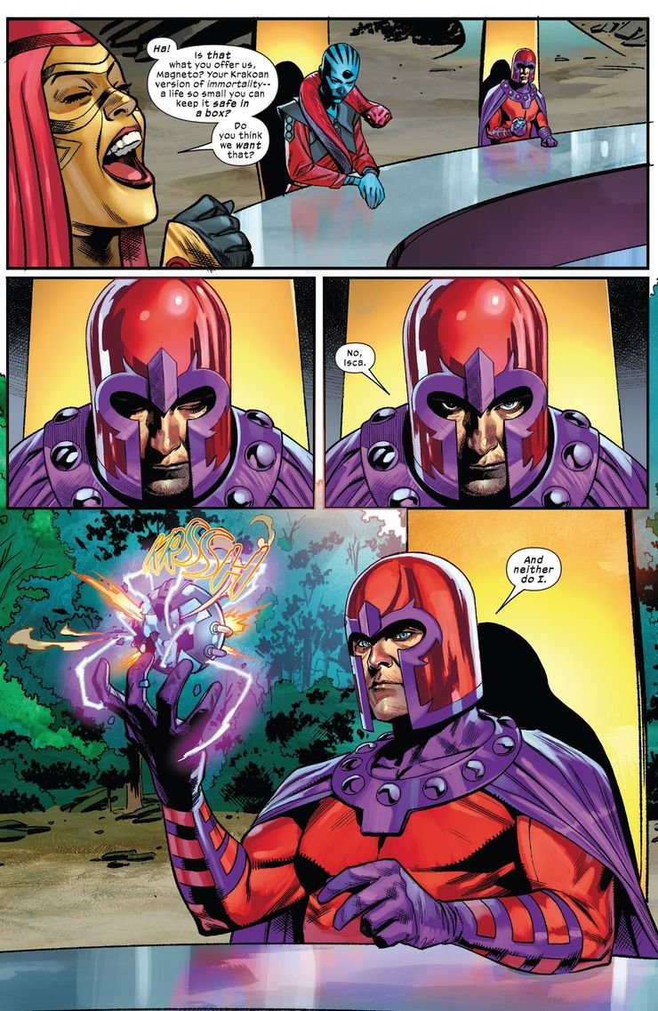 Esto puede parecer una decisión desesperada y delirantemente peligrosa por parte de Magneto y Storm, pero Magneto les dice con firmeza a los líderes del Gran Anillo que, “Nosotros dos ya no tenemos el seguro de Krakoan… Si vamos a defender a Arakko, debemos ser de Arakko. Entendemos la lógica. Entendemos el costo”. Estos dos infames mutantes de nivel Omega ahora se dedican a ayudar a transformar a Arakko en un mundo de origen mutante seguro y protegido, y reconocen que simplemente nunca podrían ganarse la confianza y la admiración de los ciudadanos de Arakki si estuvieran protegidos por el seguro de resurrección de Krakoan. Magneto señala que hay son otras formas de resucitar en Krakoa, como usar la “Sala de espera” recién creada por la Bruja Escarlata, pero que los mutantes deben querer volver a la vida para usar la Sala de espera y Magneto deja muy claro que no está interesado en la inmortalidad, solo hacer las cosas bien en la vida que tiene actualmente. Por supuesto, Ororo todavía ocupa un lugar en el Consejo Silencioso de Krakoa, por lo que seguirá estando profundamente involucrada en la política y el crecimiento de la nación Krakoana, pero al destruir sus copias de seguridad de Cerebro, está declarando firmemente que ahora es una Arakki, que resulta que tiene un asiento en el Consejo Tranquilo.