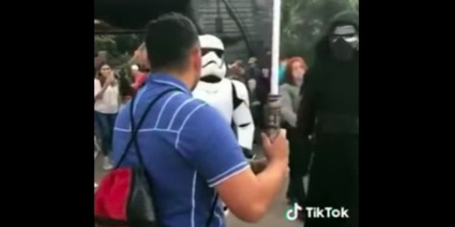 "Si queda un Jedi, no eres tú". Stormtrooper destruye a un hombre que maneja un sable de luz en Disneyland de r / videos