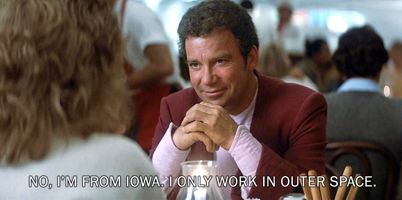 Es un poco divertido, pero también es una inversión de una de las líneas más famosas del original Kirk (William Shatner). En Star Trek IV: El viaje a casa, el Capitán Kirk y su tripulación viajan en el tiempo a fines del siglo XX para recuperar un par de ballenas jorobadas, que son la clave para prevenir una calamidad del siglo XXIII en la Tierra. Kirk intenta ganarse la confianza de la experta en ballenas, la Dra. Gillian Taylor (Catherine Hicks) durante la cena, donde ella le pregunta deliberadamente si es del espacio exterior. Kirk responde suavemente “No, soy de Iowa, solo trabajo en el espacio exterior”.