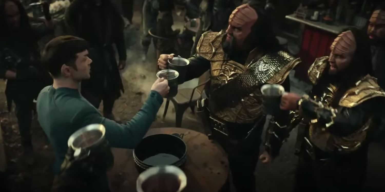 El tráiler revela que el equipo de Enterprise se encontrará con los klingon en algún momento Nuevos mundos extraños temporada 2. Hacia el final del tráiler hay una toma de un crucero de batalla klingon, pero la aparición klingon más notable se produce antes, en una breve escena que involucra al teniente Spock (Ethan Peck). En medio de un bar lleno de gente, posiblemente en Qo’nos, se ve a Spock bebiendo jarras de vino de sangre con dos compañeros klingon. Tienen el cabello largo, la barba, la armadura de batalla y las crestas en la frente distintivas de los Viaje a las estrellas: la próxima generación era Klingons, sino que también usan el oro de la Viaje a las estrellas: la serie original Klingons.