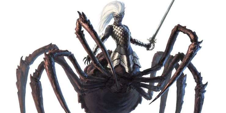La reina de las arañas demoníacas adorada por los elfos oscuros, una deidad malvada y caótica que domina a las cosas que viven en las sombras. Lolth aparece como la araña equivalente a un centauro y retuerce las mentes de aquellos con oscuridad y deshonestidad en sus corazones.