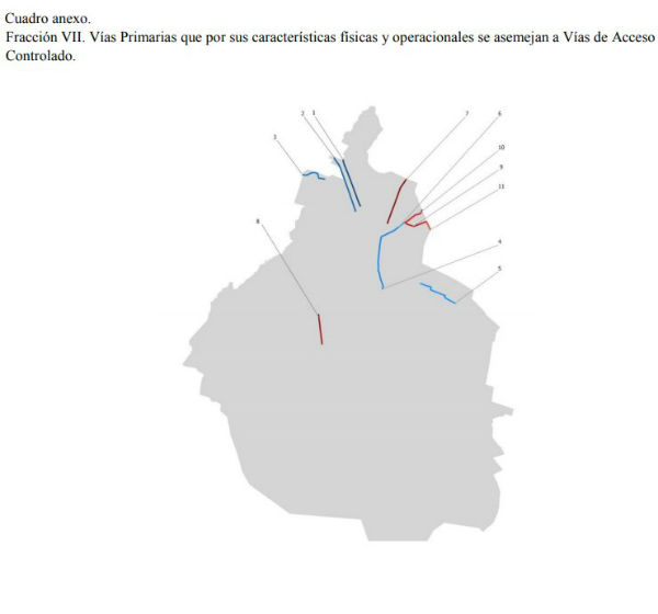 Con las reformas publicadas este martes, a las vías de acceso controlado ya mencionadas se sumarán las vías primarias “que por sus características físicas y operacionales así lo determine la Secretaría (de Seguridad Ciudadana) y la Comisión de Clasificación de Vialidades”.