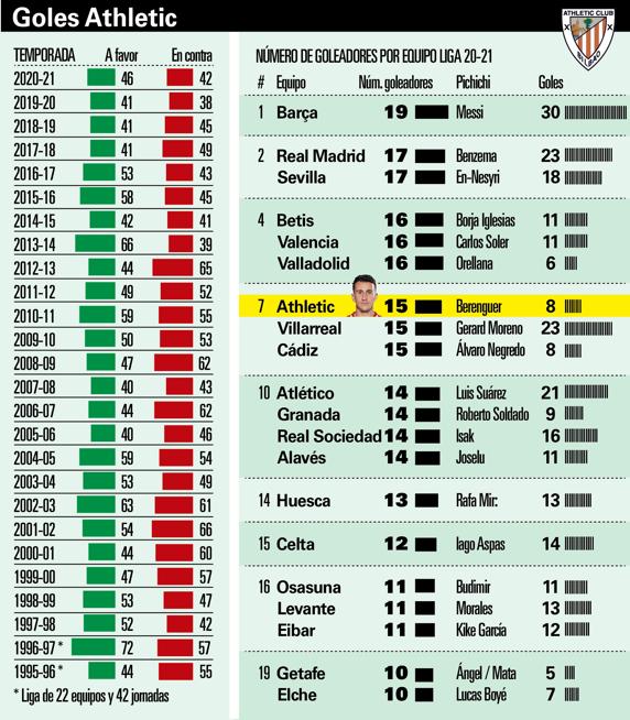 El Athletic ha finalizado la Liga 2020-21 con 46 goles a favor y 42 en contra. Son números escasos en el primer apartado, pero bastante buenos en el segundo. El equipo rojiblanco ha cerrado la temporada con el undécimo peor balance realizador desde que la victoria se premia con tres puntos. En este periodo de 26 campañas que comenzó en la 95-96, se han dado otras diez campañas con registros más negativos, comenzando por las tres anteriores: 2019-20, 2018-19, 2017-18, las tres con 41 tantos a favor. El conjunto bilbaíno también tuvo peores números en los cursos 2014-15 (42), 2012-13 (44), 2007-08 (40), 1995-96 (44), 2000-01 (44) y en los dos del bienio negro (40 en la 2005-06 y 44 en la siguiente), cuando se vio muy comprometida la permanencia en la máxima categoría del fútbol estatal, especialmente en el segundo año con aquel partido al límite ante el Levante disputado en la vieja Catedral el 17 de junio de 2007.