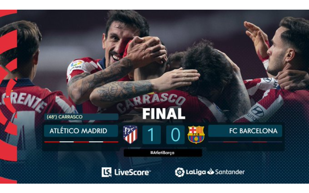 Con este resultado, Atlético de Madrid llega a 20 unidades, con dos partidos pendientes, en el segundo lugar general; en tanto, Barcelona se estancó con 11 puntos en el lejano décimo puesto, también con un par de juegos reprogramados.