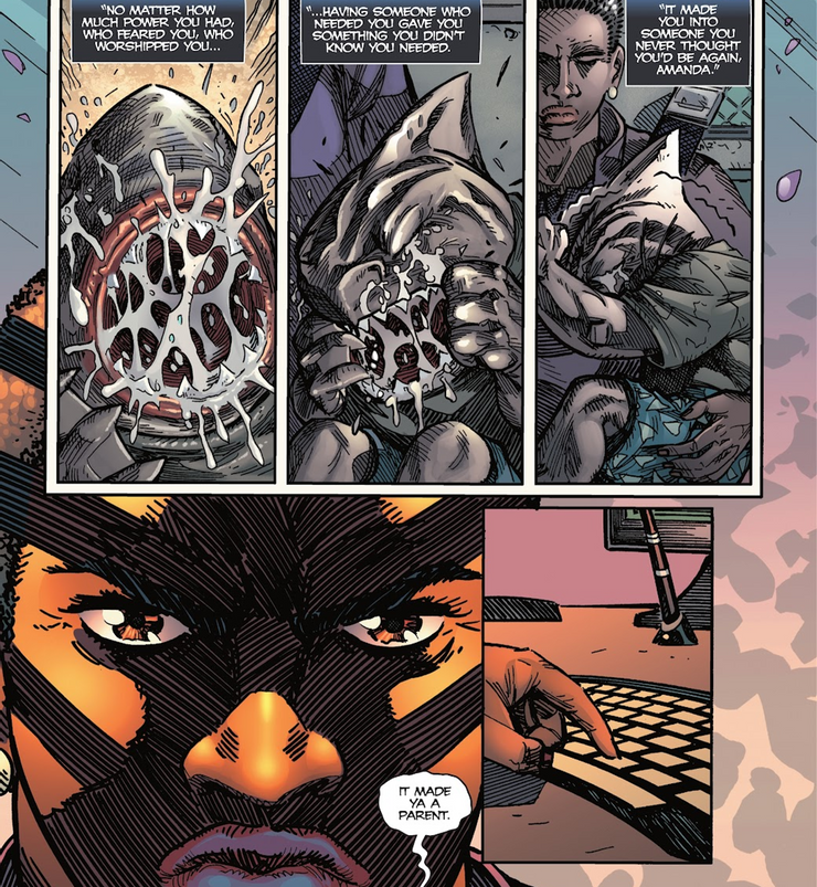 Al regresar de los Juegos Salvajes, King Shark le dice a Waller que a partir de ahora elegirá sus misiones con Suicide Squad, actuando como un héroe brutal en lugar de su músculo villano. Cuando Waller amenaza con matar a Defacer en lugar de aceptar sus términos, Nanaue revela que sabe que el jefe de Suicide Squad no hará algo tan cruel, porque ella considera a King Shark su hijo. Números anteriores revelaron que Chondrakha, queriendo que Nanaue viviera una vida dura para estar listo para los Juegos Salvajes, se lo entregó a Waller como un arma viviente. Pero resulta que King Shark era tan joven que Waller no solo estaba a cargo de un activo sobrehumano, sino de un niño con el corazón roto. “Tener a alguien que te necesitaba te dio algo que no sabías que necesitabas” Rey Tiburón dice. “Te convirtió en padre”.