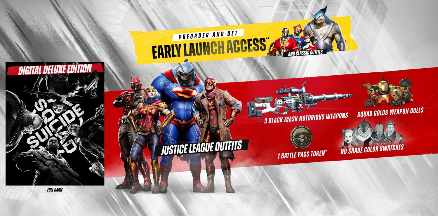 La Edición Deluxe también incluye tres armas Black Mask Notorious, muñecos de armas Squad Golds y una muestra de color “No Shade” exclusiva de la versión digital que parece imitar el aspecto del sombreado de celdas de los cómics. También contiene un token del Pase de batalla canjeable por acceso al Pase de batalla premium en lo que WB espera que sea de hasta 4 temporadas.
