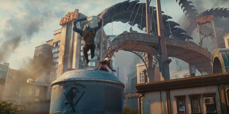 Cuando se prepara para el eventual viaje a Metrópolis para derribar a Brainiac, Suicide Squad se encuentra con el inventor Gizmo, quien proporciona al grupo un arsenal de armas y artilugios. El tráiler muestra a Harley Quinn usando una pistola de agarre que se parece mucho a la que usa Batman en todo el Hombre murciélago: Arkham serie. Harley dispara la pistola de agarre a la distancia y rápidamente es sacada de la pantalla, pero parece que finalmente lo consigue, ya que el tráiler original la muestra balanceándose sin esfuerzo por Metrópolis.