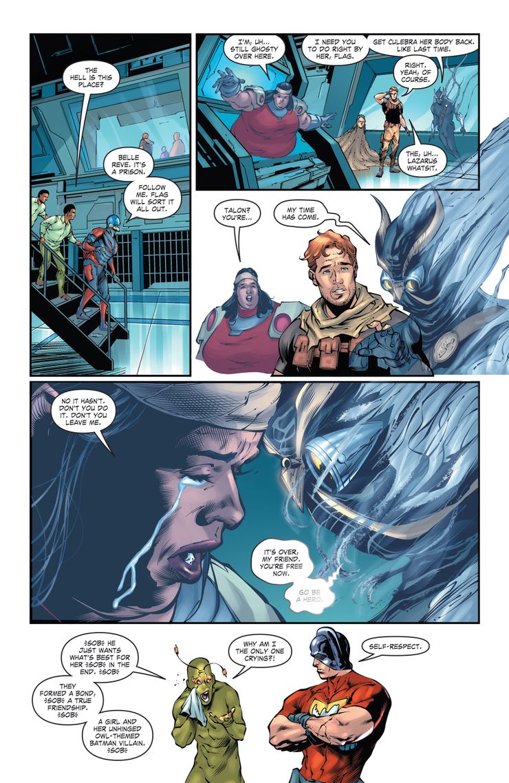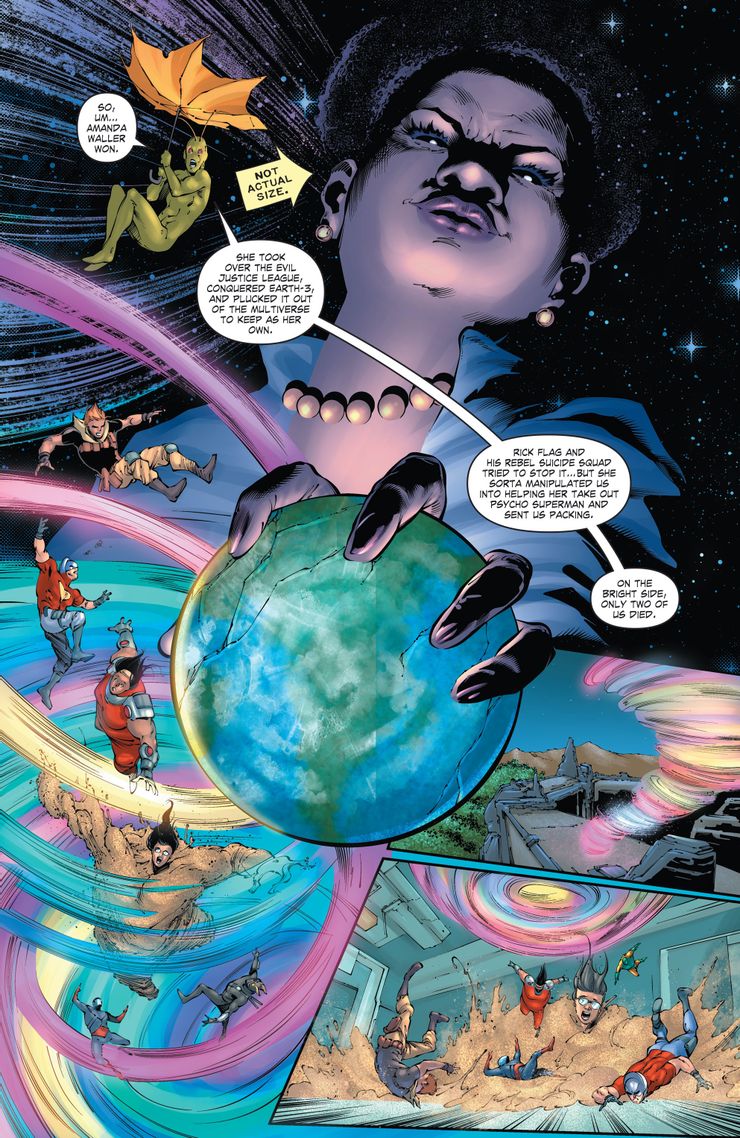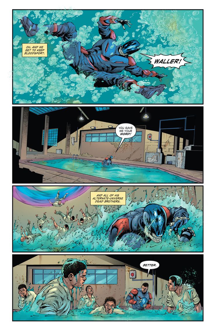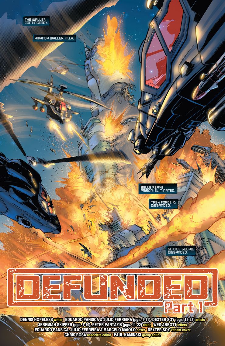 El polvo de la Guerra por Tierra-3 se ha asentado y el equipo de Rick Flag ha sido enviado de vuelta a Tierra-0. De vuelta en la sede del Escuadrón Suicida en Belle Reve, Rick Flag y el resto intentan decidir el futuro del equipo. De repente, suena una alarma, advirtiendo al equipo que tienen “entrantes”. Luego, los lectores ven una flota de helicópteros atacar la prisión, como parte de algo llamado “Contingencia Waller”. Una narración dice que Waller está MIA, que Belle Reve será destruida y que Suicide Squad se disolverá.