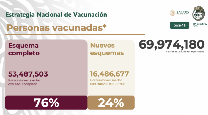 Con esquema completo se reportan 53 millones 487 mil personas, mientras que ya hay 16 millones 486 mil con nuevos esquemas. El comunicado oficial indica que la estrategia ya alcanzó a 78 por ciento de la población de 18 años y más.