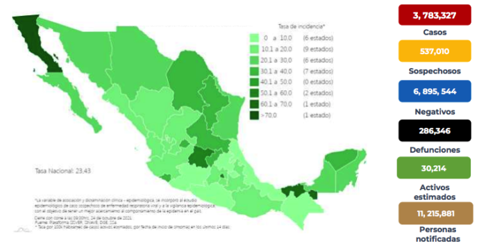 La Secretaría informó que al corte del día de hoy se tienen registrados 28 mil 529 casos activos con una tasa de incidencia de 22.1 por 100 mil habitantes.