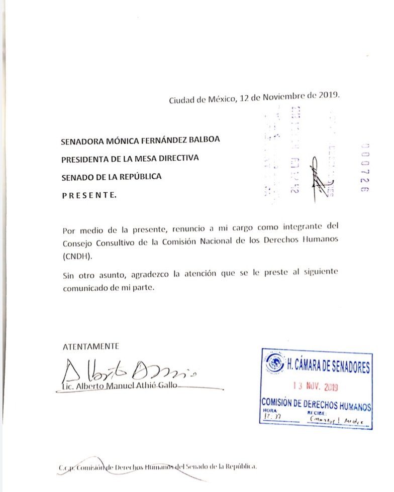 Además de Athié, otros cuatro integrantes del Consejo Consultivo de la CNDH presentaron la renuncia a su cargo honorífico, con carácter de irrevocable.