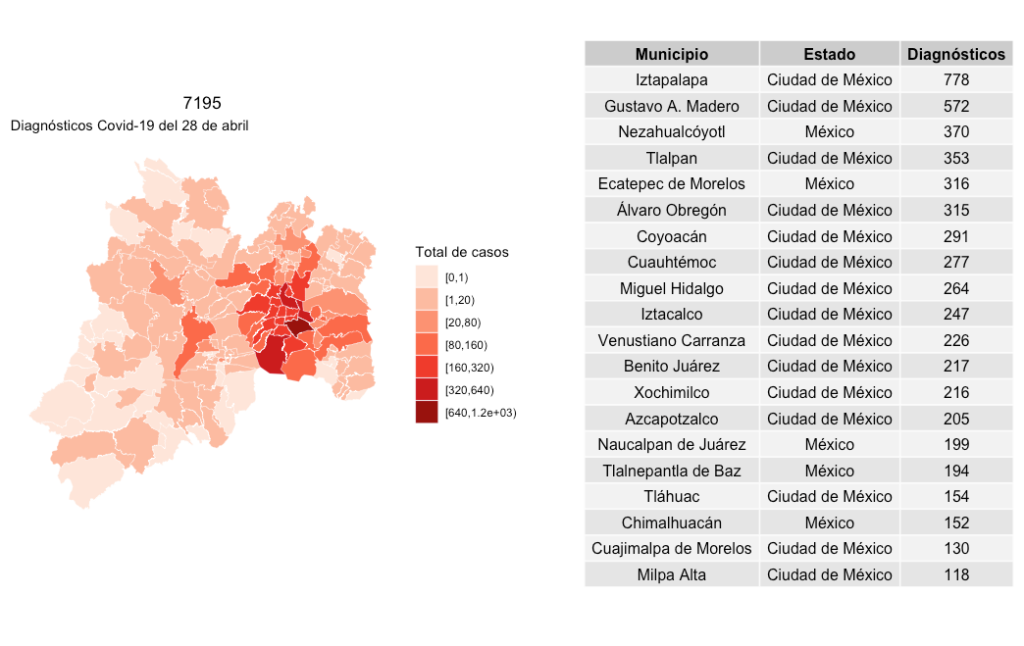 En esta región las localidades con más casos son: Gustavo A. Madero (CDMX) con 572 diagnósticos, Nezahualcóyotl (Edomex) 370, Tlalpan (CDMX) 353 y Ecatepec, con 316.