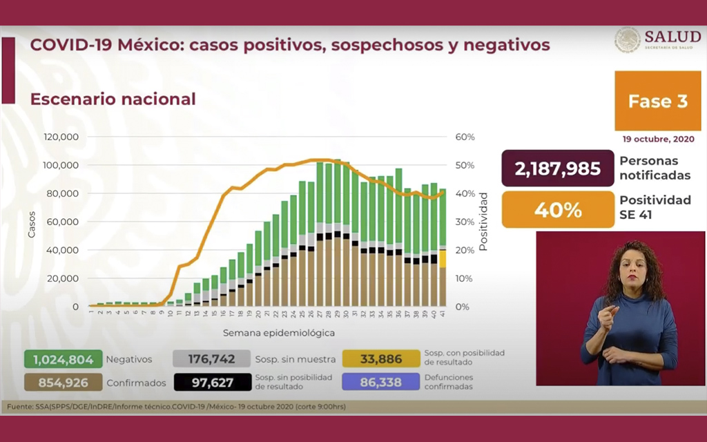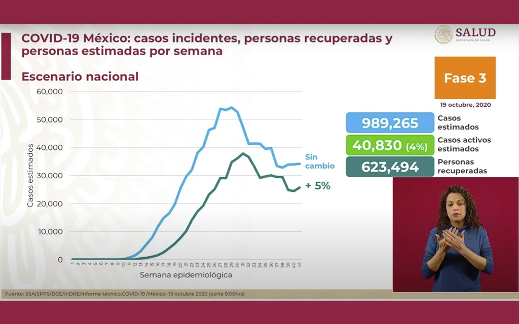 Los casos estimados de Covid-19 en México ascienden a 989 mil 265, informó la Secretaría de Salud, si bien los casos confirmados son 854 mil 926.