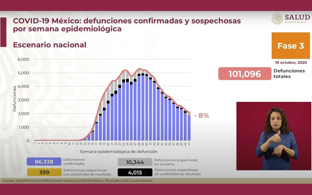 El número de muertes totales por Covid-19 -confirmadas y sospechosas- en México, fue estimado en 101,096 por la Secretaría de Salud.