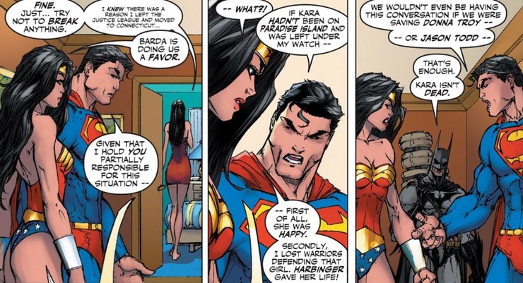 Cuando Supergirl se estrella por primera vez en la Tierra en Superhombre/Batman #8, Batman inmediatamente sospecha de su supuesto origen a pesar de la fe inmediata de Superman en su primo recién descubierto. Estas tensiones iniciales solo crecen cuando Bruce va a espaldas de Clark para representar el secuestro de Kara por parte de Wonder Woman como una prueba. Superman está menos que satisfecho con los métodos de sus amigos, y aunque la propia Kara parece feliz de entrenar con Diana en Paradise Island, Trinity está tan ocupada discutiendo entre ellos sobre qué es lo mejor para ella que casi no tiene nada que decir. Pronto, las cosas empeoran cuando la joven Supergirl es secuestrada por las fuerzas de Darkseid. Clark da un golpe especialmente bajo a sus dos amigos más cercanos al invocar a sus protegidos muertos cuando dice: “Ni siquiera estaríamos teniendo esta conversación si estuviéramos salvando a Donna Troy o Jason Todd”. Trinity logra superar sus diferencias y rescatar a la Chica de Acero, pero toda esta terrible experiencia realmente resalta cuán diferentes son.