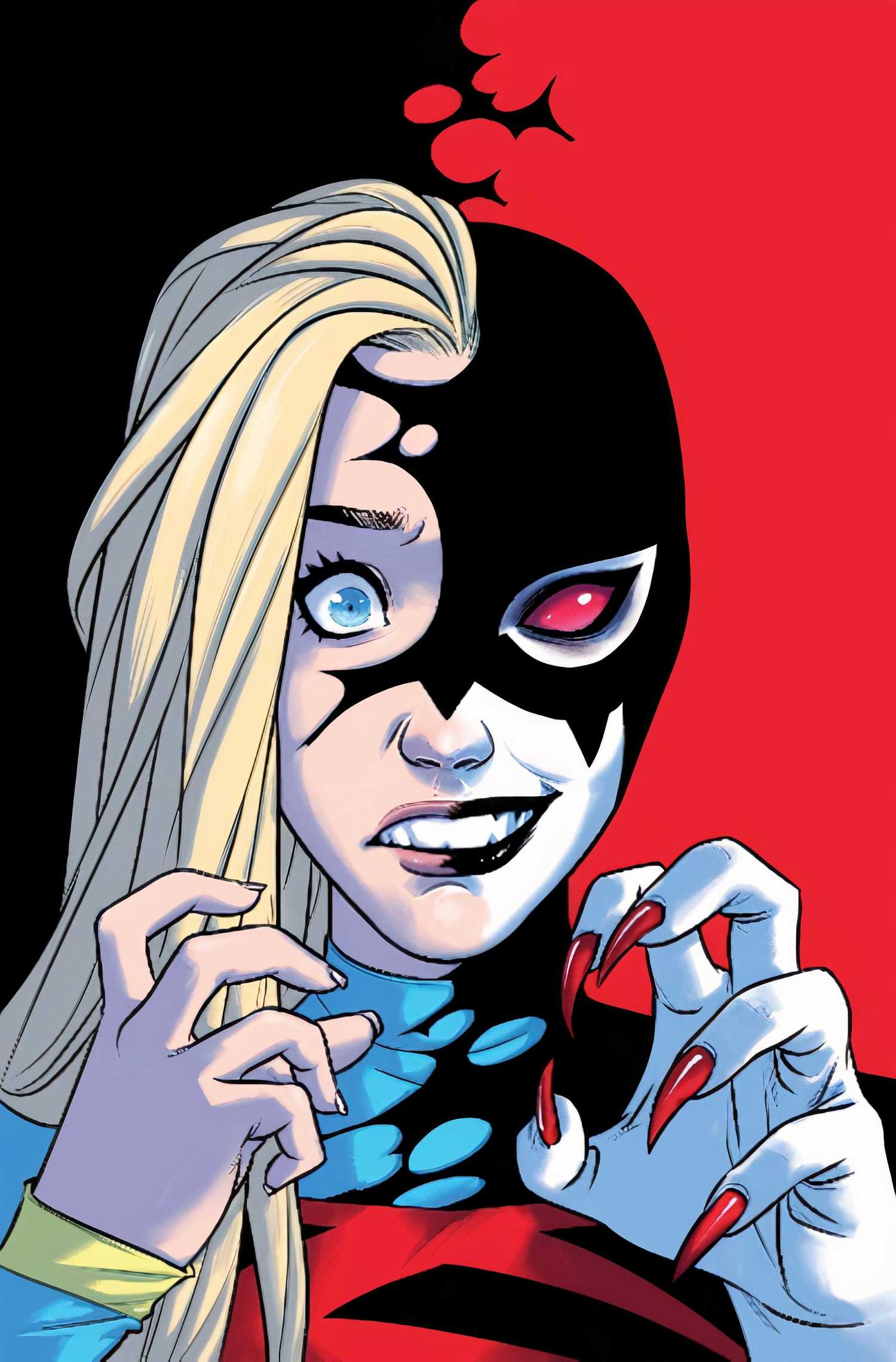 Esto da como resultado que Kara y Krypto se conviertan en versiones deformadas de sí mismas, completadas con importantes cambios visuales. Sus apariciones físicas cambian, con ojos sin pupila rosa rojizo y piel o piel blanqueada. Sus trajes tradicionales súper familiar también se alteran, asumiendo un esquema de color rojo y negro, y sus capas y “S” Los escudos parecen desgastados y corrompidos.