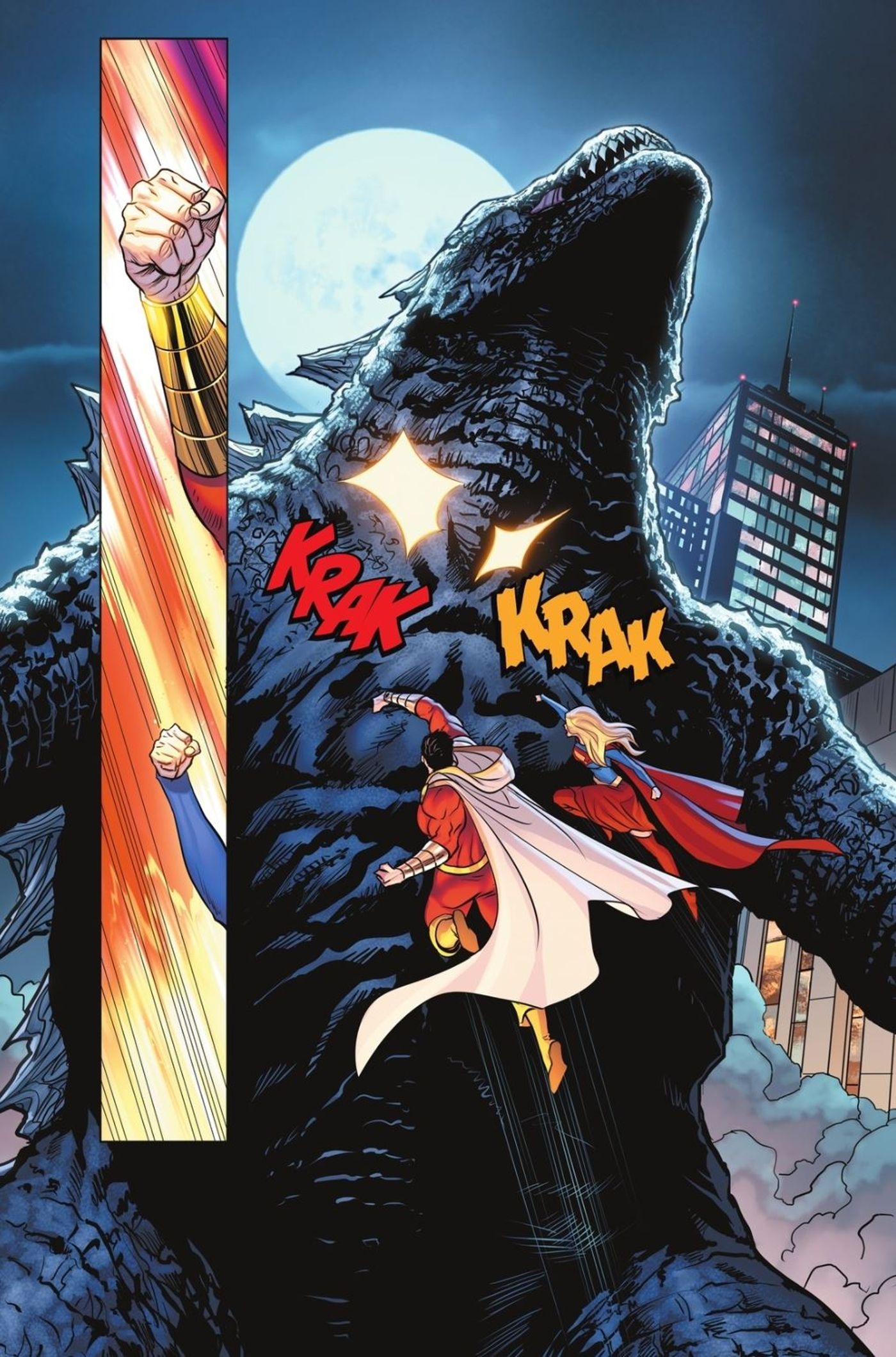 En Liga de la Justicia contra Godzilla contra Kong # 3 Por Brian Buccellato y Christian Duce, Superman acaba de ser derrotado por Godzilla y el resto de la Liga está luchando para detener al resto de los Titanes invasores. Sin embargo, Supergirl y Shazam se vengan de Superman golpeándole a Godzilla en la mandíbula.