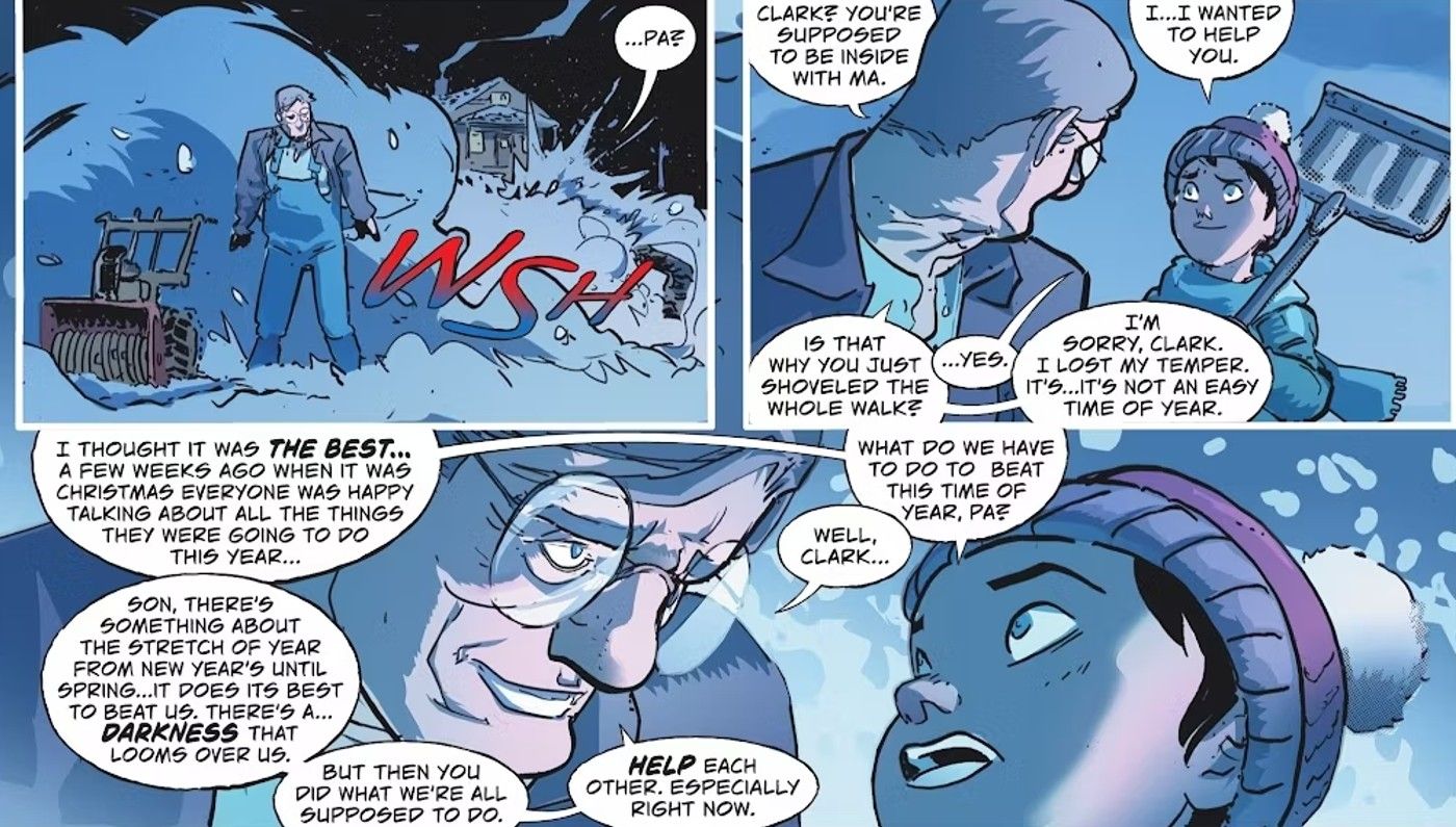 Lo fascinante de todo esto es que no hay motivo para que Superman se vea afectado por el trastorno afectivo estacional. Si bien Luthor propone que la mayor distancia del sol durante el invierno debilitaría los poderes de Superman, el cambio de las estaciones localmente significa muy poco para un ser que simplemente puede volar a donde sea primavera en otro lugar, o incluso directamente al sol. Más bien, el problema parece surgir de una conversación con su padre al comienzo de la historia, donde Pa Kent le dice a un joven Clark que “hay algo en el tramo del año desde el año nuevo hasta la primavera… hace todo lo posible para ganarnos. Hay una…oscuridad que se cierne sobre nosotros.” Claramente, Clark ha tomado estas palabras muy en serio, ya que los siguientes paneles muestran al Superman de hoy en día esforzándose conscientemente para aumentar sus esfuerzos heroicos inmediatamente después del Año Nuevo.