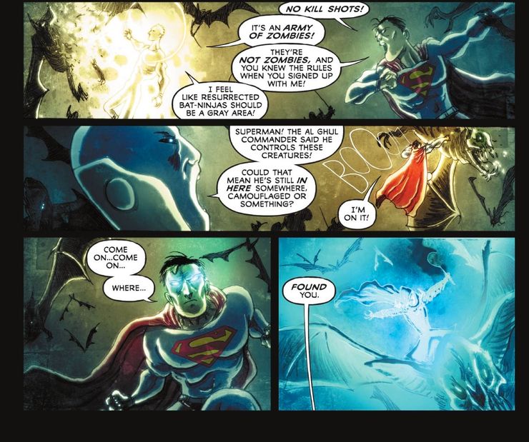 Cuando los Al Ghuls amenazan a Superman y su equipo, él les dice que no pueden matar a sus enemigos, aunque parezcan muertos vivientes. “No son zombis, y conocías las reglas cuando te registraste conmigo”. “Siento que los murciélagos ninjas resucitados deberían ser un área gris”. Superman tiene razón en que siguen siendo seres humanos, a pesar de haber resucitado, porque no son inmortales. Su comentario hace que los Al Ghuls sean fácilmente comparables a los ninjas “The Hand” de Marvel. Aunque representados con emociones, los Vengadores no piensan en la Mano como seres humanos. Durante todo el evento Shadowland y Nuevos Vengadores: Ronin, los héroes más poderosos del mundo matan sin pensar a los ninjas. Si bien los Vengadores no lo consideran una cuestión de moralidad, Superman está completamente en desacuerdo y mantiene a sus aliados en un estándar más alto de lo que el Capitán América espera de sus amigos.