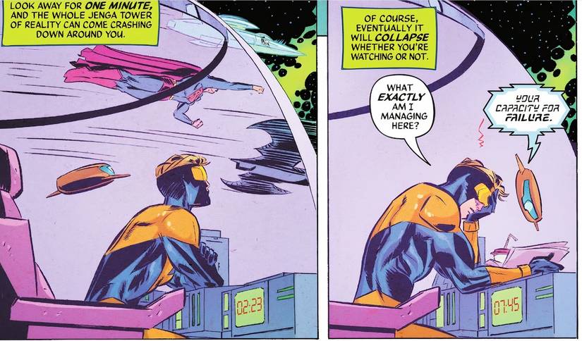 Hay algo de humanidad real detrás de las payasadas de Booster Gold, y aprecio la representación de un superhéroe con depresión que no es sombría ni cruda.