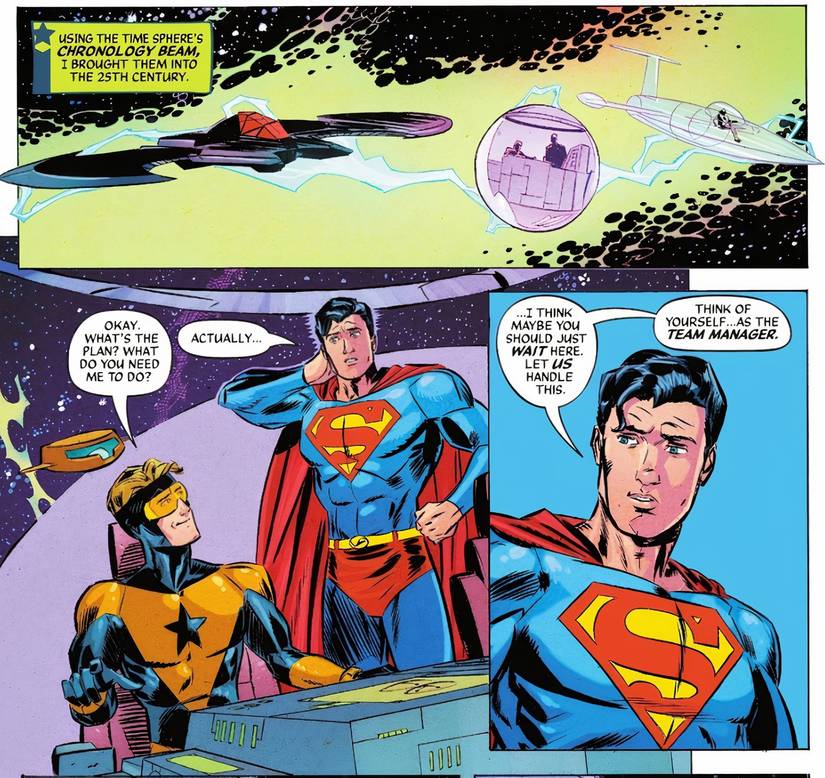 A primera vista, al ser designado como el “TGerente de equipo” de la Liga de la Justicia por Superman puede parecer un inmenso honor. Sin embargo, el cómic deja en claro que las motivaciones de Superman no tienen nada que ver con honrar a Michael. Mientras los dos héroes, junto con Wonder Woman y Batman, se acercan al asteroide, Booster pregunta cuál es el plan y cómo puede ayudar. En respuesta a la suposición de Booster de que estaría involucrado activamente, Superman dice torpemente: “…Creo que tal vez deberías esperar aquí. Deja que nos ocupemos de esto. Piensa en ti mismo como el director del equipo.“