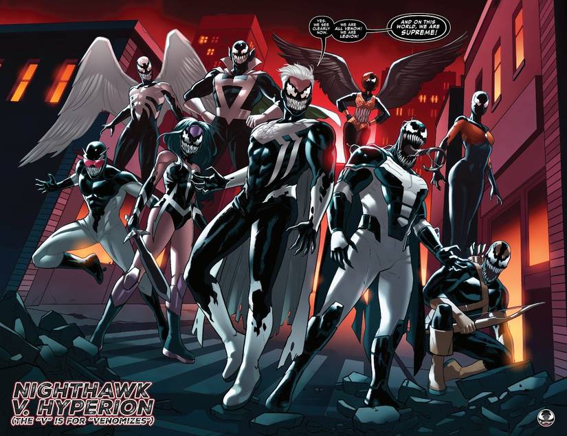 En Venomverso Renacido #4los fanáticos pueden ver el horrible potenciador de Hyperion. En la historia, el pastiche de Batman de Marvel, Nighthawk, se enfrenta a Hyperion en una parodia de las historias de ‘Batman vs Superman’. Nighthawk revela rápidamente que ha usado su gran fortuna para recolectar un simbionte del espacio profundo y usarlo para aumentar sus poderes. Mientras Hyperion lucha tan duro como puede, finalmente es infectado por el simbionte, uniéndose al resto del Escuadrón Supremo en su mente colmena simbionte y declarando: “¡Todos somos Venom! ¡Somos legión!”