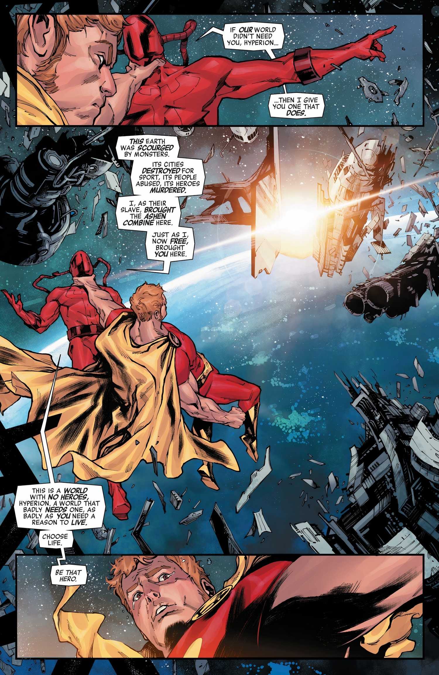 Hyperion obtiene el final que se merece en este número. La vida de Hyperion está en ruinas y amenaza con desquitarse en la Tierra. Los Vengadores, que han peleado con Hyperion en el pasado, saben que sus intenciones son buenas, pero continuamente parece equivocarse. En Tierra-901, Hyperion puede dejar atrás el pasado y ser el héroe que estaba destinado a ser. A la gente de Tierra-901 no le importa el pasado de Hyperion, sólo su presente. Hyperion tiene todo superman poderes, lo que significa que la gente de Tierra-901 finalmente obtiene el campeón que necesitan, e Hyperion tiene el final que se merece.