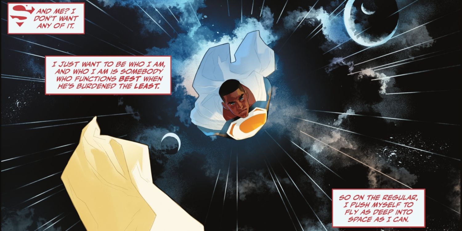 Este Energía DC La historia muestra cómo, para esta versión de Superman, su propia “Fortaleza de la Soledad” es el vacío del corazón del universo mismo. Como afirma el héroe en su monólogo interior: “Trazo un rumbo más allá del borde exterior de los soles amarillos, subiendo de nivel mis poderes. Viajo a través de planetas muertos, recorro años luz en un instante para llegar a donde quiero estar… el corazón del universo. El borde de la creación.“La historia muestra cómo, cuando Clark Kent usa su mejora de poder para defender la Tierra como Superhombre, Val Zod lo usa para alejarse lo más posible del planeta, todo para disfrutar de la soledad.