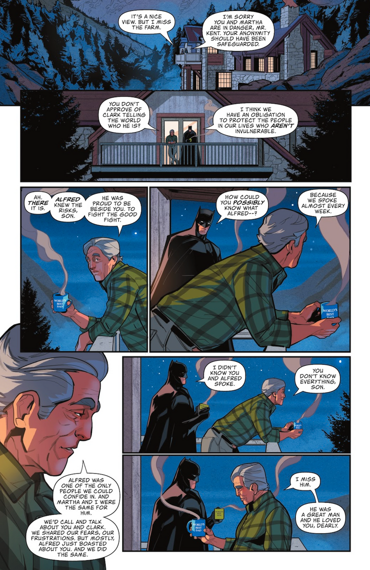 La práctica de que los superhéroes mantengan identidades secretas cayó en desgracia alrededor de la década de 2000; tanto el Capitán América como Iron Man revelaron sus identidades al mundo en 2002 (y el MCU Hombre de Acero famosa película terminó con el mismo gesto en 2008). En Superman: Hijo de Kal-El #11, escrito por Tom Taylor con arte de Cian Tormey, Batman tiene una discusión con Johnathan Kent sobre la decisión de Superman de revelar públicamente su propia identidad (visto en superhombre #18). Batman comienza con el argumento probado y verdadero de que los superhéroes ocultan sus identidades para proteger a sus amigos y familiares, pero Kent no escuchará nada al respecto; está orgulloso de ser parte del círculo de amigos de un héroe, al igual que Alfred lo fue para Batman.