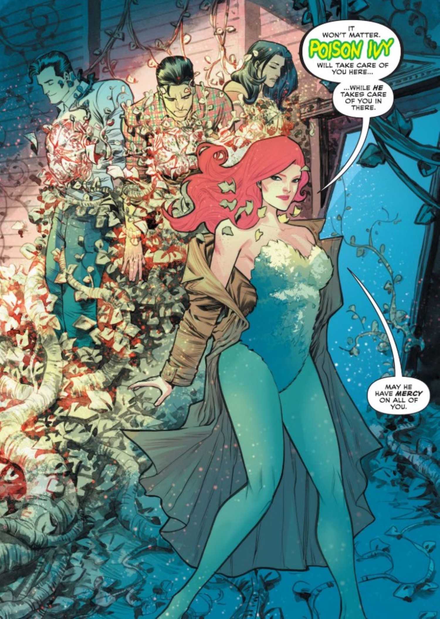 En este caso, Ivy usó sus poderes que controlan las plantas y su profunda conexión con el verde para tomar el mando de la misericordia negra e infectar la Trinidad. Marcó otro momento en el que apenas tuvo que levantar un dedo para derribar al hombre de acero. Finalmente, Superman y el resto de la Trinidad logran liberarse tanto del Black Mercy como del control de Mongul.