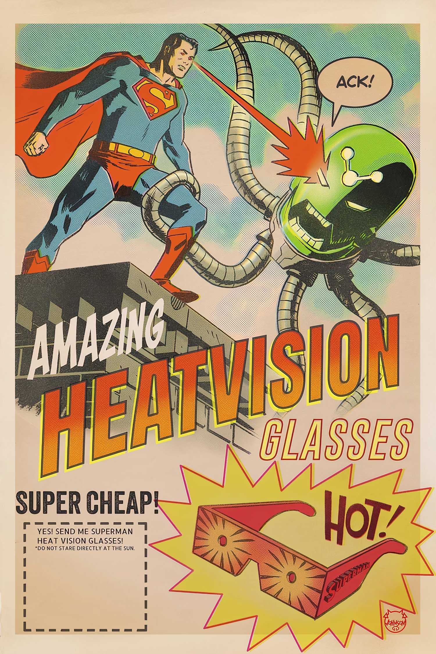 La portada de Dave Johnson está diseñada para parecerse a los anuncios que solían aparecer en las contraportadas de los cómics. Pero en lugar de una colonia de monos marinos o un par de gafas de rayos X, Este anuncio muestra un par de “gafas con visión térmica” de la marca Superman (junto con una advertencia de no mirar directamente al sol).