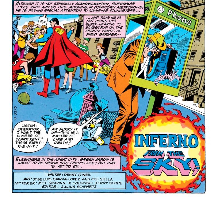 En la primera página de este cómic, se muestra a Superman hablando con un grupo de niños. La narración de apertura incluso menciona que “…él está prestando especial atención a admirar a los jóvenes.” Sin embargo, justo detrás de él está Fred Garmer, que pronto será asesinado, tratando desesperadamente de llamar a Clark Kent porque es “una cuestión de vida y muerte.” Lo que es desconcertante es que Superman está justo detrás de él, pero no escucha nada. Se distrae tan fácilmente hablando con los niños que de alguna manera ni siquiera capta a alguien que está a su lado en pánico con su súper audiencia El cómic incluso lo llama, diciendo que su conversación distraída lo ha impedido usar sus poderes, mencionando que él es “no usar su súper oído para escuchar a escondidas las palabras frenéticas de Fred Garmer.”