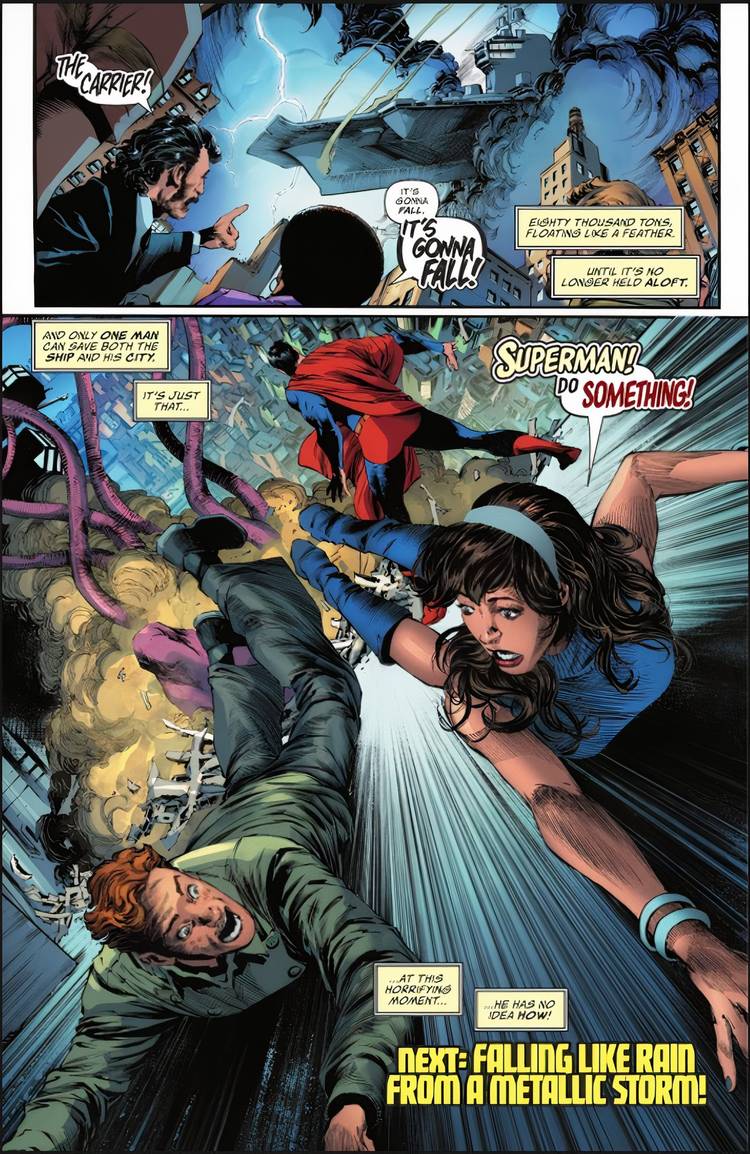 Tras el triunfo de Superman, los invasores alienígenas revelan su mentalidad de malos perdedores al lanzar una enorme nave de guerra sobre Metrópolis, amenazando con destruir la ciudad y poniendo en peligro a Jimmy y Lois a bordo de la nave. Esto prepara el escenario para el siguiente gran conflicto en la segunda parte de Superman y elDesafío de las estrellasSerá fascinante presenciar cómo Clark se las arregla para salvar tanto la ciudad como el barco en el próximo número. Si bien levantar el barco de guerra para ponerlo a salvo parece una solución obvia, la narrativa de Simone sugiere que nos espera un desafío más complejo. Superhombrelo que hace que la resolución que ha elegido sea aún más convincente de anticipar.