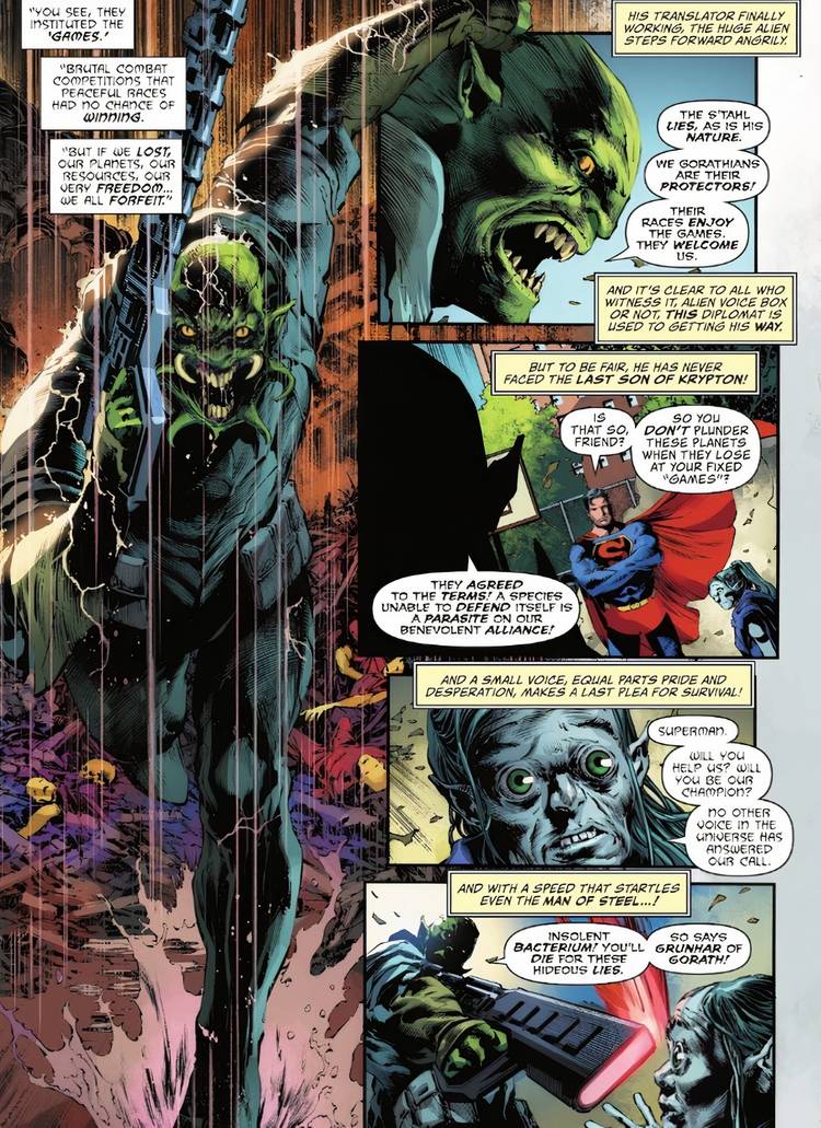 Xalt, un extraterrestre cautivo de un planeta previamente conquistado, le explica la terrible situación a Superman: los goratianos, extraterrestres invasores, obligan a los planetas pacíficos a participar en brutales competiciones de combate a las que llaman “juegos.“Los planetas que pierden pierden sus mundos natales, recursos y libertad ante los gorathianos. Xalt insta a Superman a defender la Tierra y todos los pueblos conquistados. Al principio, Clark se niega a participar, pero opta por liberar a Xalt y a los demás enfrentándose a su captor. Sin embargo, Los Gorathianos amenazan con la destrucción total de la Tierra a menos que Superman cumpla las reglas y participe en los juegos..