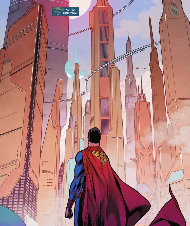 Superman se da cuenta de que está en Kryptonsu planeta natal destruido. Además, como está en el pasado, el planeta permanece intacto y floreciente. Este impactante regreso a Krypton marca un momento monumental en la historia de Superman, ya que los cimientos mismos de su origen son desarraigados en gran medida.