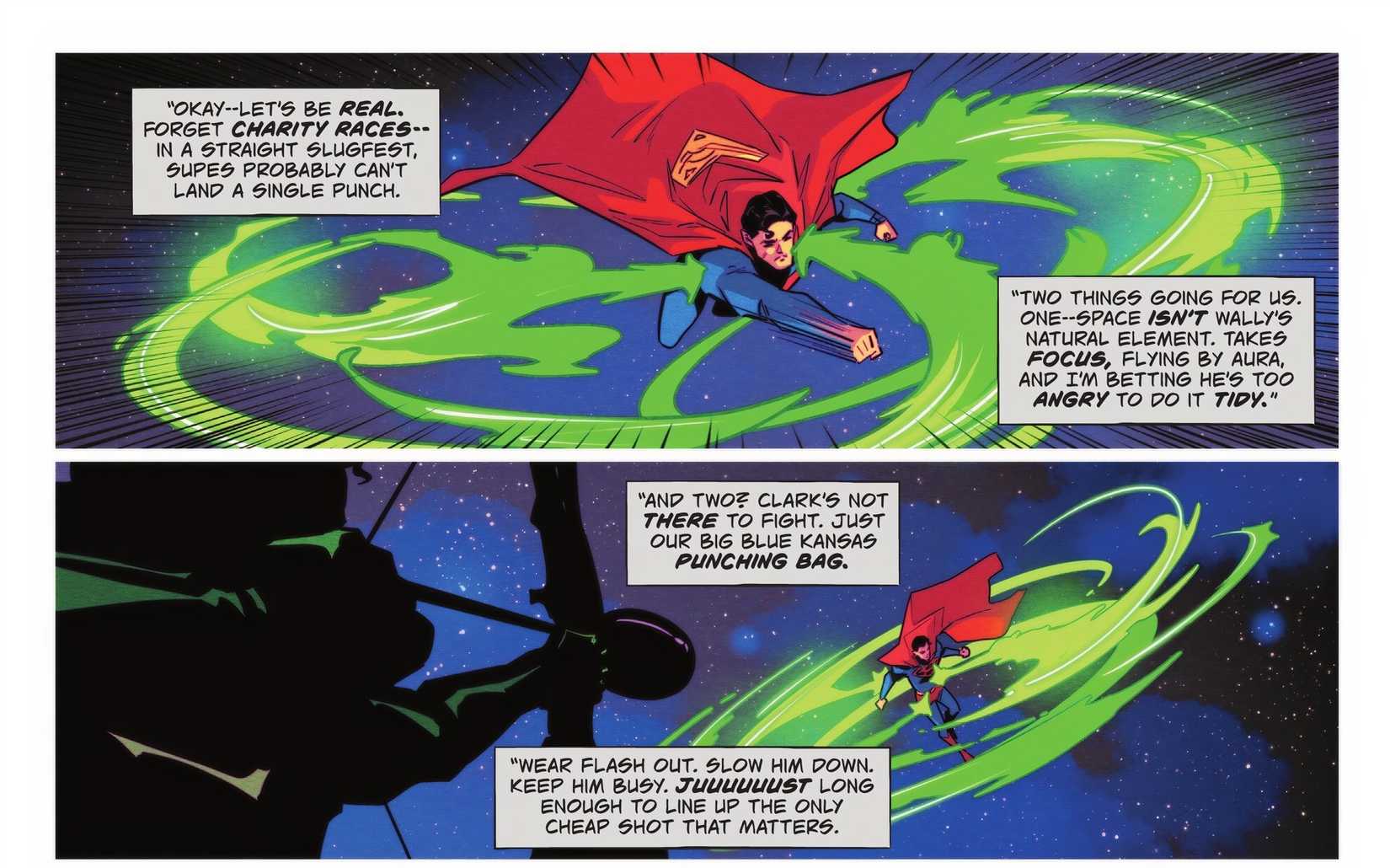 A pesar de que Superman es la potencia residente del equipo, toda la Liga de la Justicia parece compartir la creencia de que en una confrontación directa, Clark no podría obtener un golpe. Sus creencias se prueban de inmediato, ya que Wally todavía logra evitar ser golpeado por Superman, incluso en un entorno que no se adapta a las habilidades de Flash. Linda lo dice mejor en su discusión con Mister Ferrific: The Flash simplemente ha existido durante demasiado tiempo y ha aprendido demasiado sobre sus poderes. La fuerza de Superman no es simplemente nada en comparación con cuánto Flash ha descubierto sobre su velocidad.